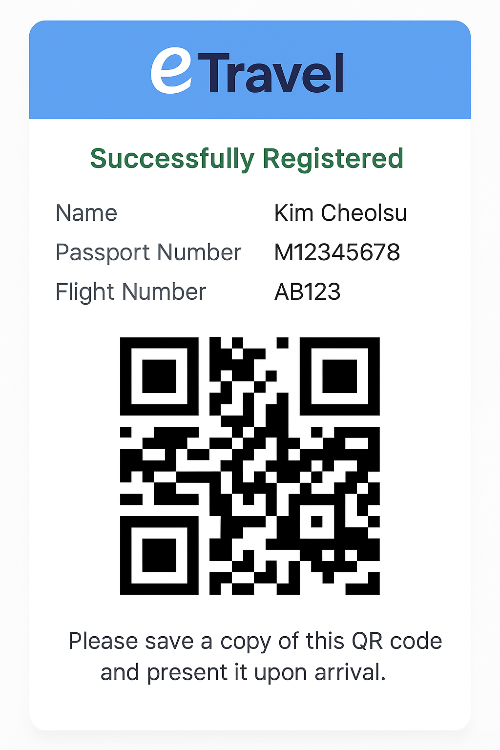 ✅ 예시 이미지 : eTravel 등록 완료 후 발급되는 QR코드 샘플 이미지